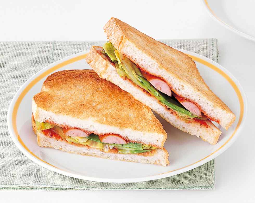 3の2枚のトーストしたパンの片面に、4のマスタードケチャップを塗り、炒めた2をはさむ。カリカリのトーストに、シャキシャキの野菜炒めが◎